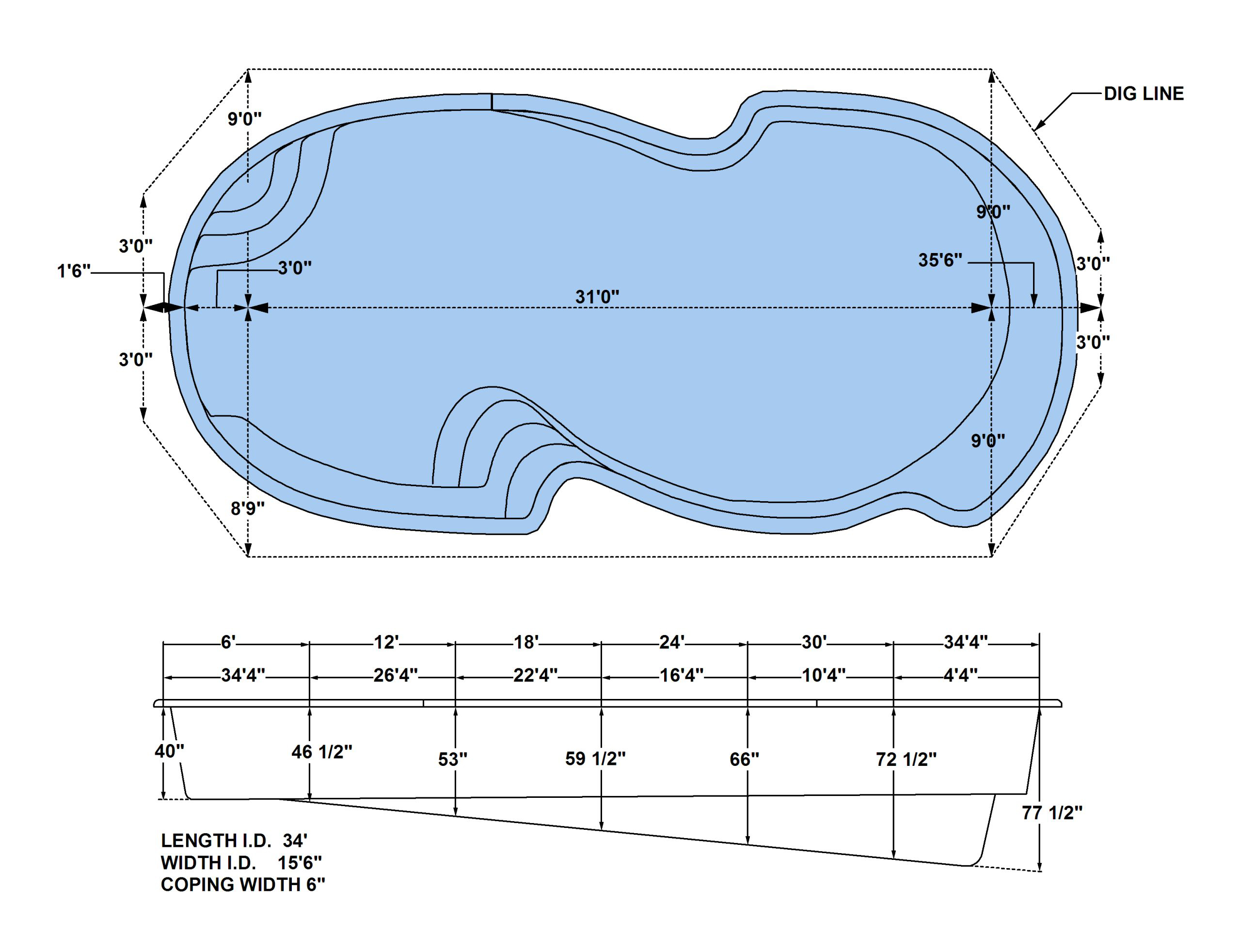 Here is a look at a few of our larger popular fiberglass pools styles and sizes from 14 x 30 on up. You will never have to replace liners, or refinish your pool every 8 years. Make the right choice and choose an inground fiberglass swimming pool today. If you want to view more styles, shapes and prices please contact us at 386-775-7914 or 386-717-6650.